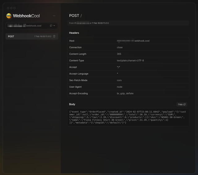 Then let's try to send an event by going to the server event test page http://localhost:4000/__front-commerce/test/events and check out the Webhook.cool page.